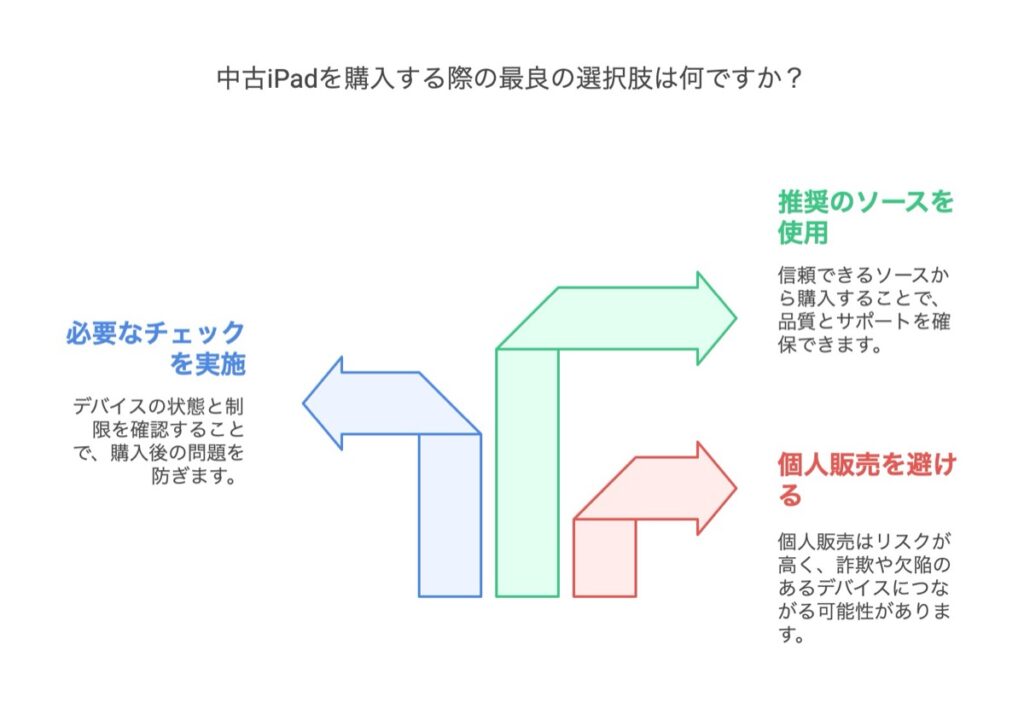 iPadの中古品を購入する際は、個人間での売買を避け、信頼できるショップを選ぶことが重要です。
